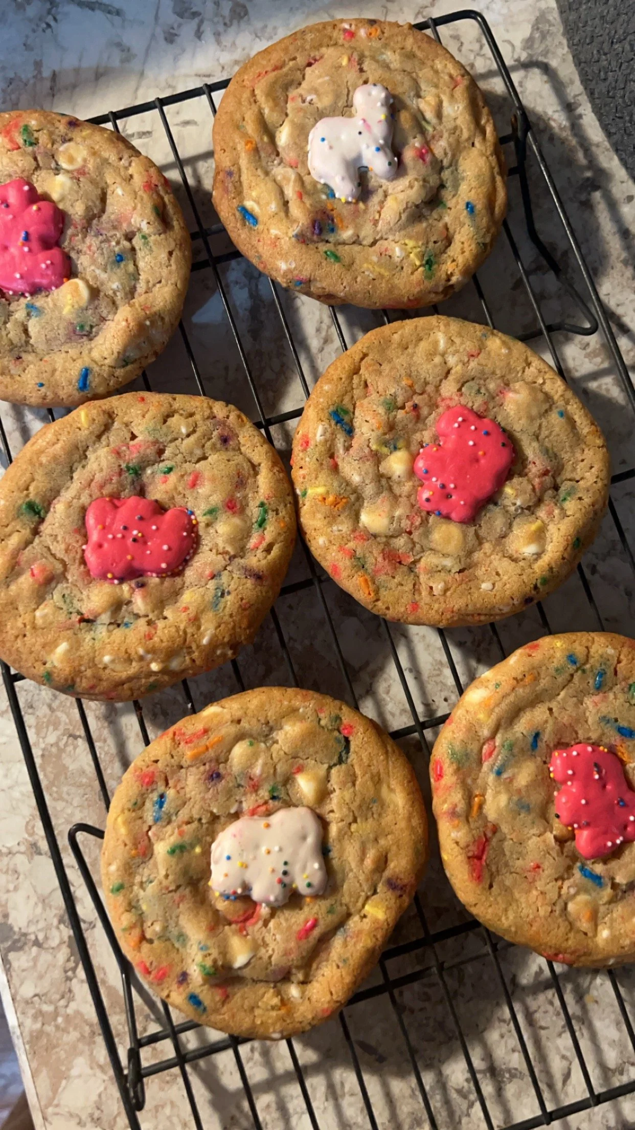 White chocolate chip cookie, filled with crushed golden Oreos. Topped with a golden Oreo cookie.