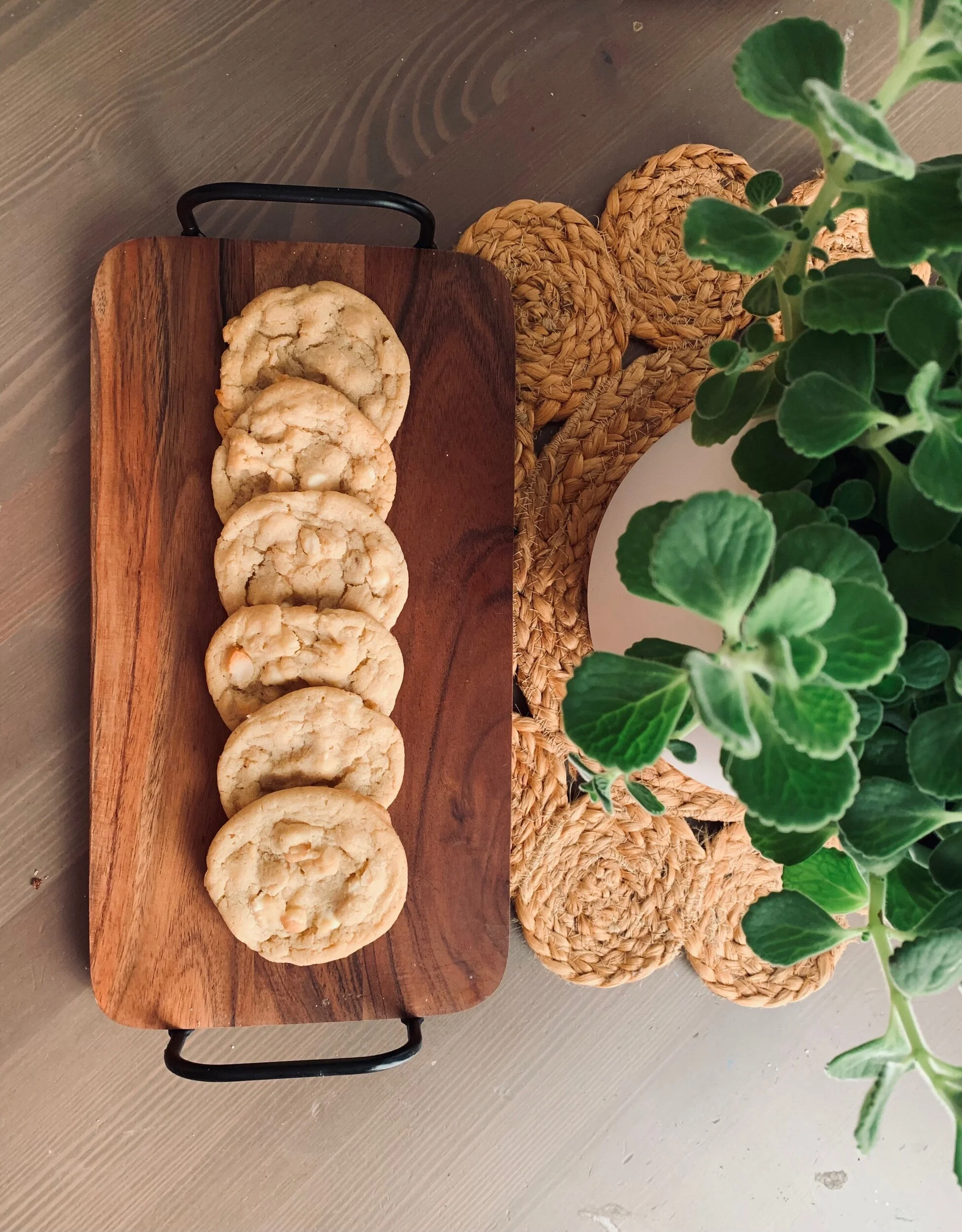 Soft chewy cookie with chunks of white chocolate and macadamia nuts