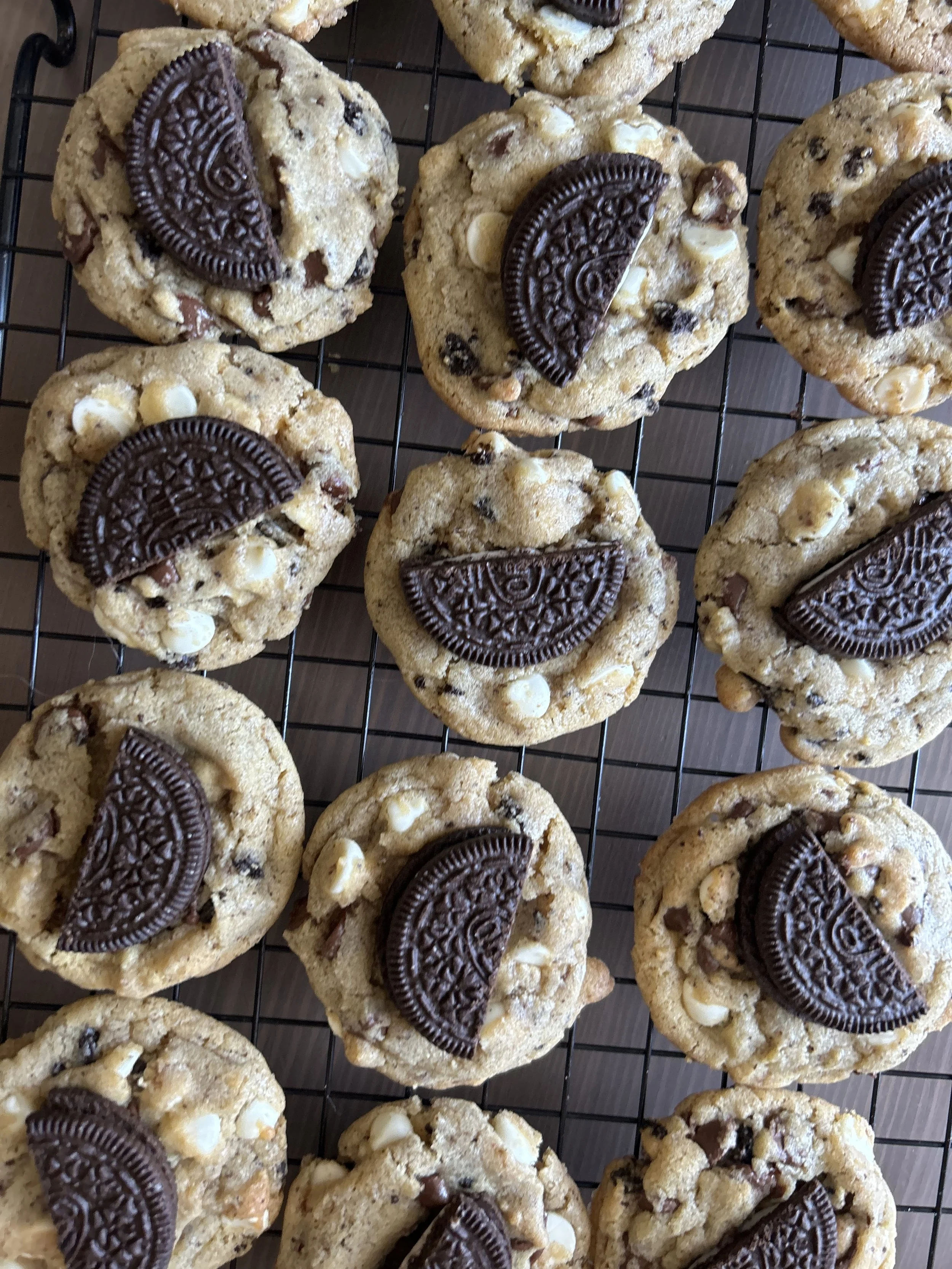 Chocolate chip cookie filled with milk chocolate chips, white chocolate chips and crushed Oreos. Topped with an Oreo cookie.