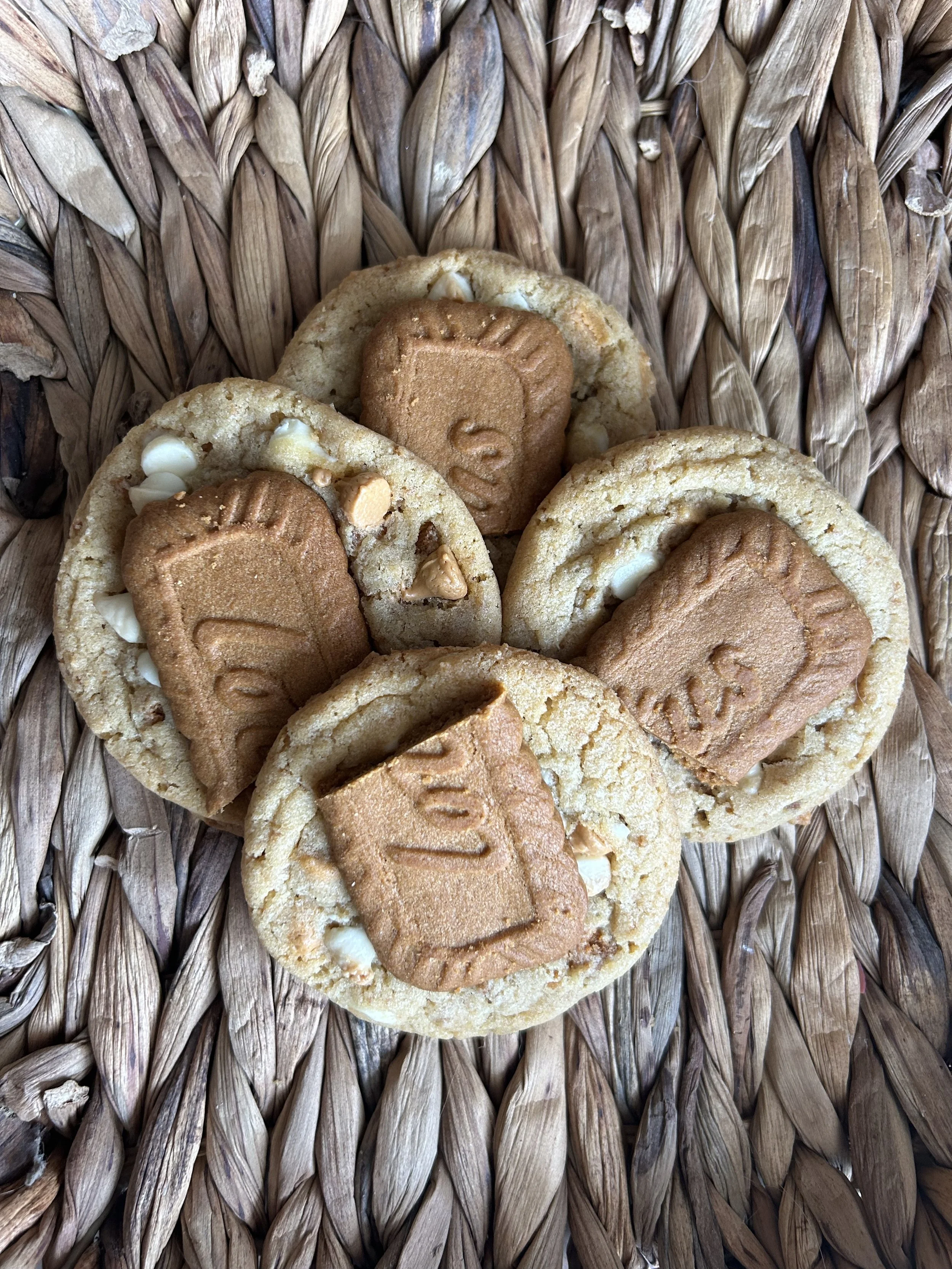 A Biscoff inspired cookie filed with crushed biscoff cookies, white chocolate chips, butterscotch chips. Topped with half a biscoff cookie.
