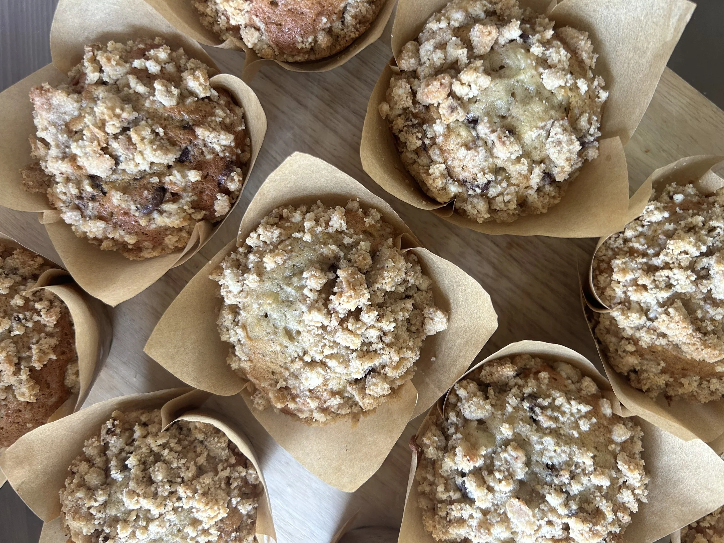 Jumbo banana muffins, filled with semi sweet chocolate chips topped with a brown sugar crumble.