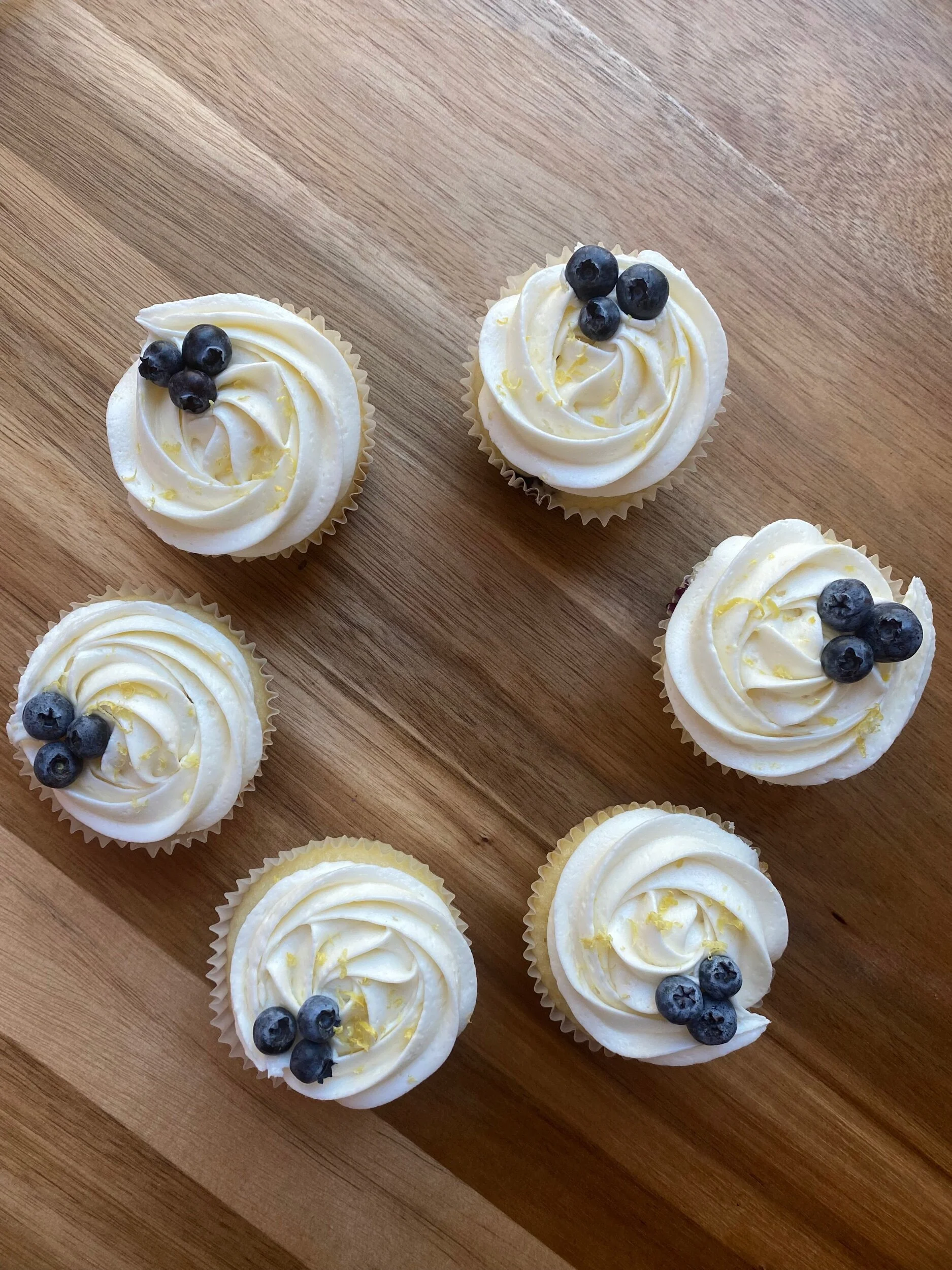 Lemon flavored cupcake filled with fresh blueberries, topped with lemon buttercream that’s sprinkled with a lemon zest