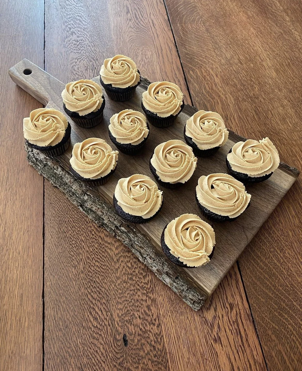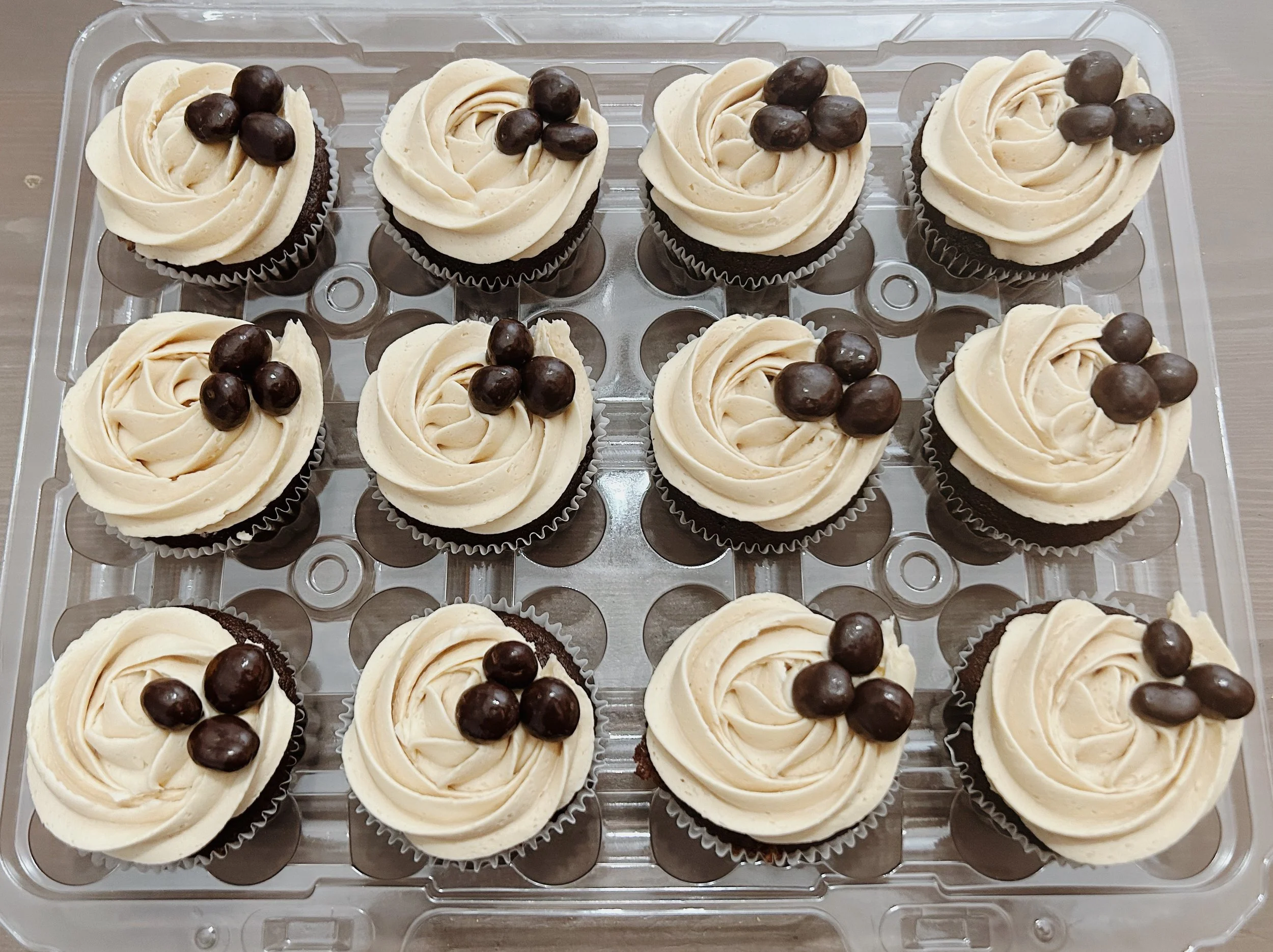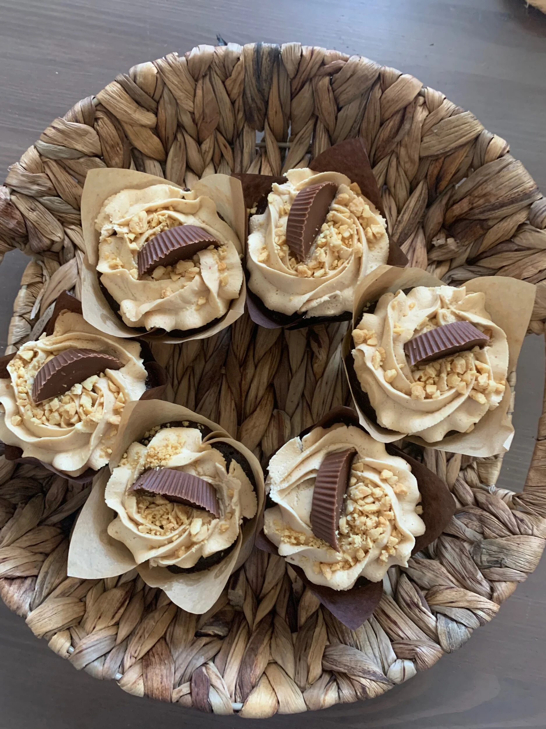Chocolate cupcake, topped with peanut butter buttercream, crushed peanuts, and a Reese’s peanut butter cup