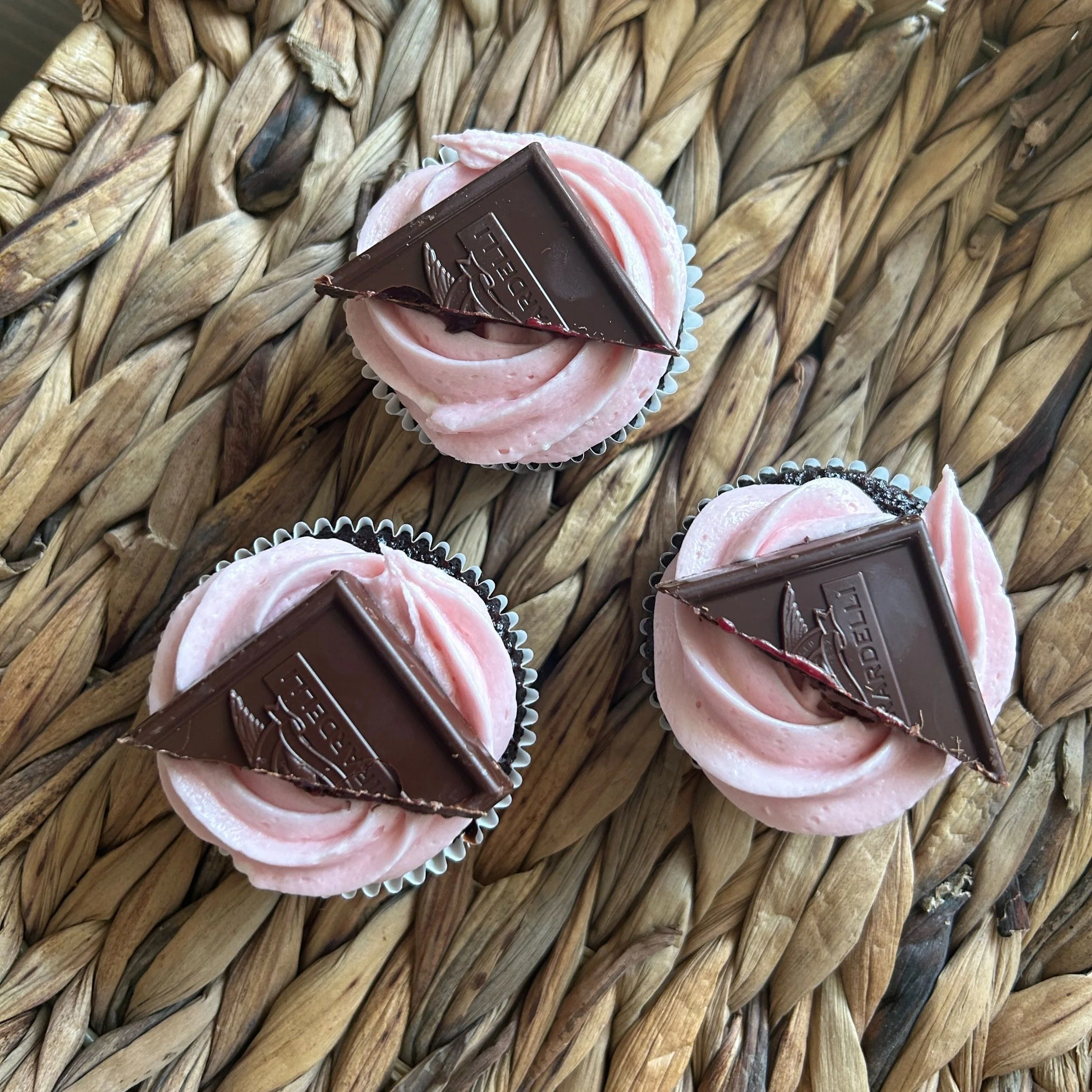 Dark chocolate cupcake, topped with a fresh raspberry buttercream and a ghiradelli dark chocolate with raspberry filling