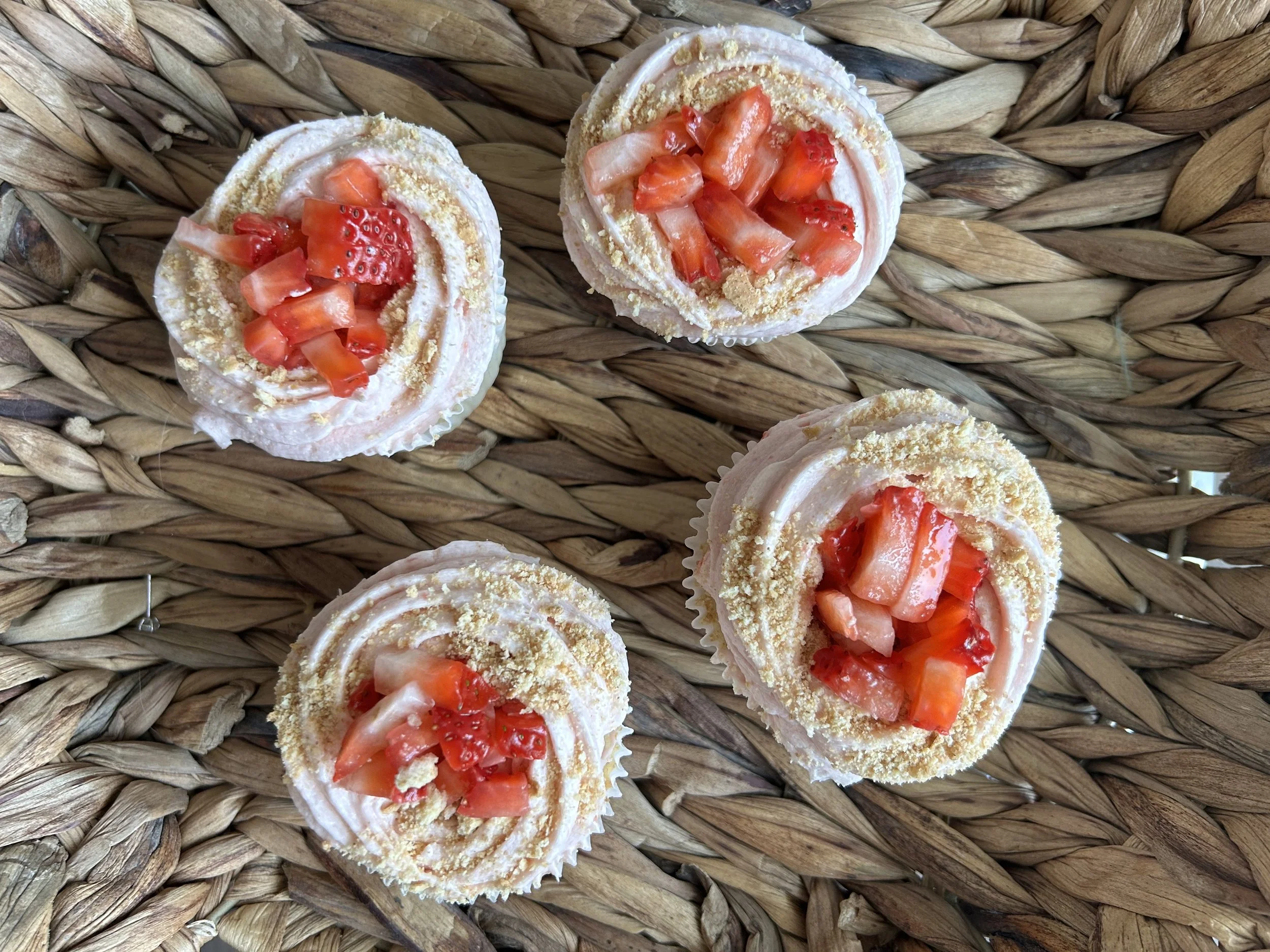 Vanilla cupcake filled with a cheesecake mousse, topped with a strawberry buttercream.